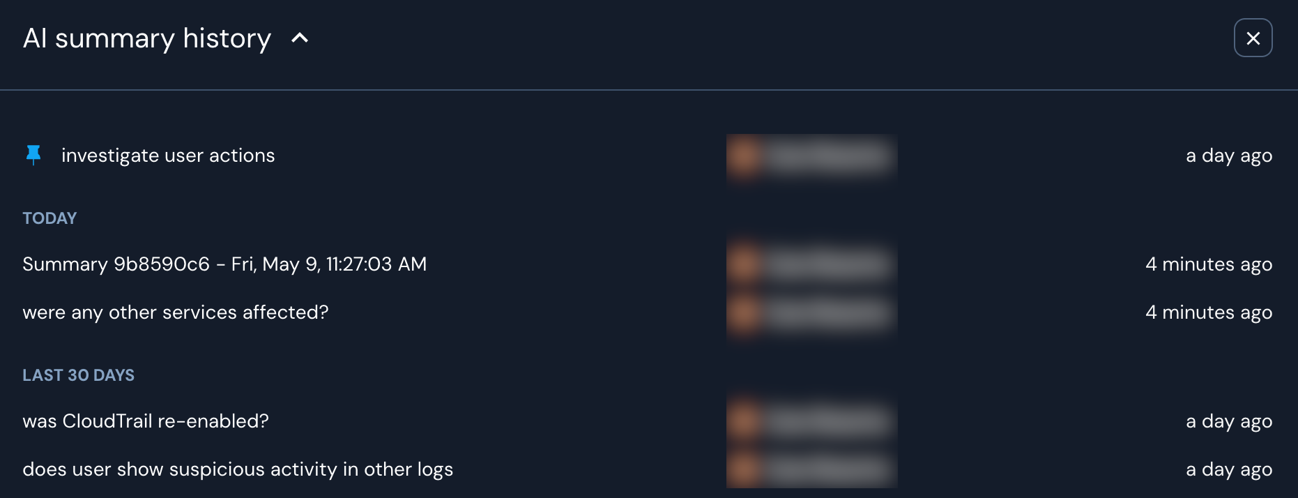 * If there are more than one previously generated AI responses for this alert or Search results set, if an AI response [has been pinned](#pinning-an-ai-response), that one will be shown. Otherwise, the most recent AI response will be shown.