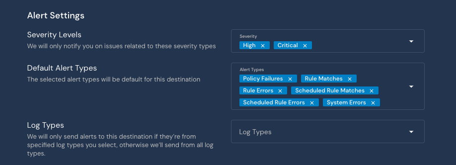 * If the destination is configured to only accept alerts from certain **Log Types**, that list must include the log type associated with the alert.