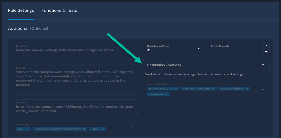 * In the Console, destinations are defined within a detection's **Rule Settings**, using the **Destination Overrides** field.