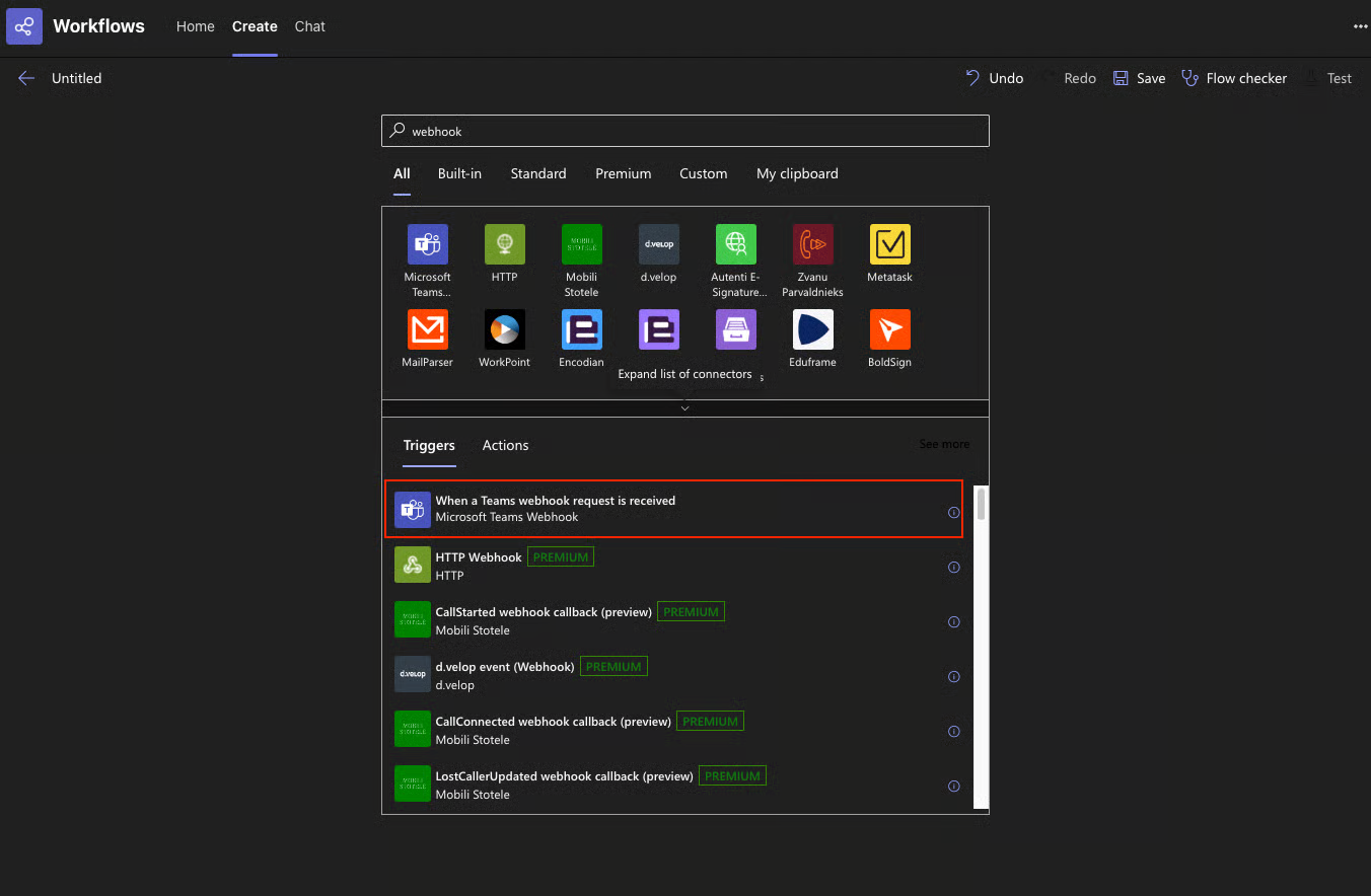 3. Search the trigger "When a Teams webhook request is received" and add to the flow.