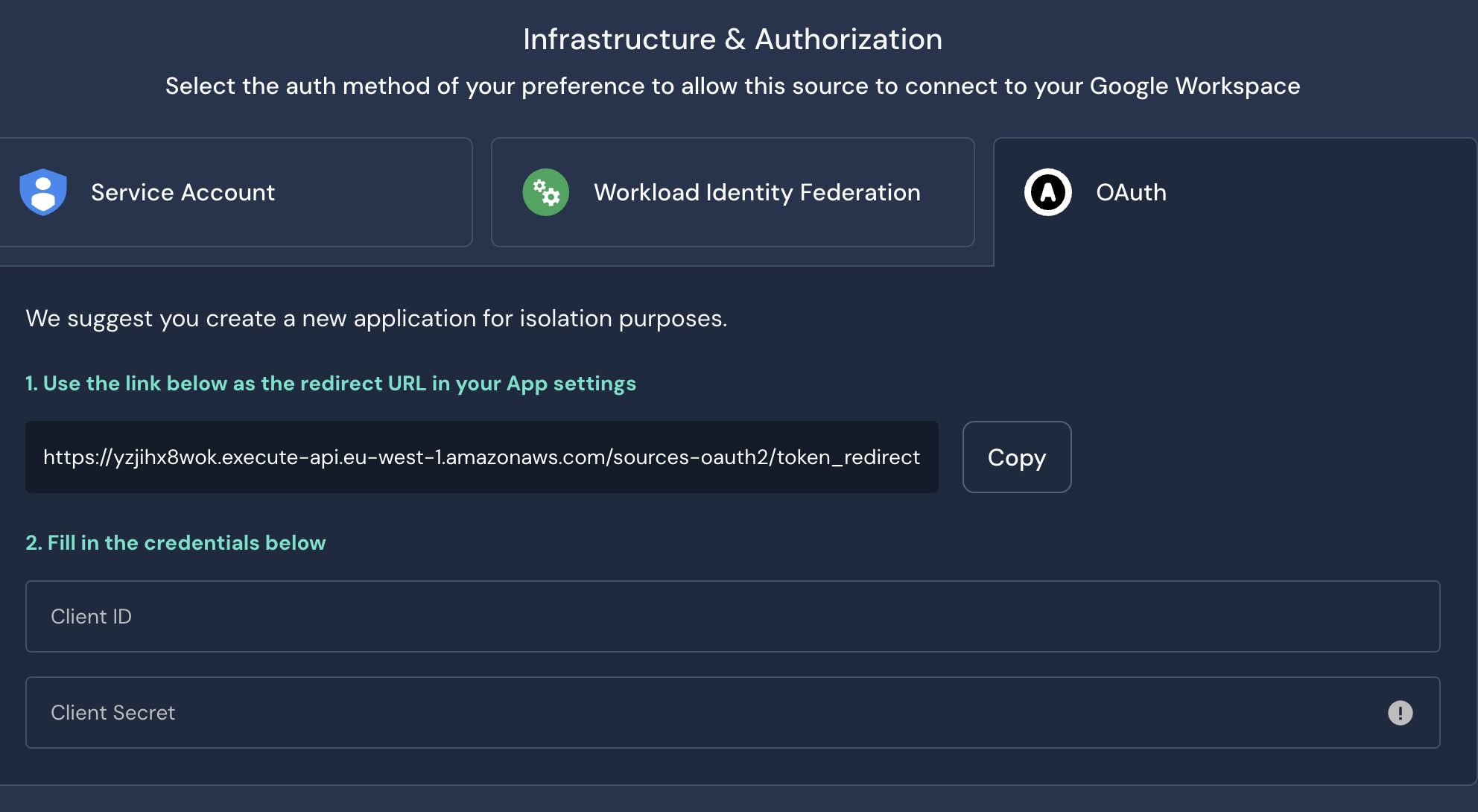 Google Cloud 앱을 설정하기 전에 인증 방법을 선택해야 합니다. 다음을 사용할 수 있습니다 [서비스 계정](https://cloud.google.com/iam/docs/service-account-overview), [워크로드 아이덴티티 페더레이션](https://docs.cloud.google.com/iam/docs/workload-identity-federation), 또는 [OAuth](https://developers.google.com/identity/protocols/oauth2) —아래 최상위 탭을 참조하세요.