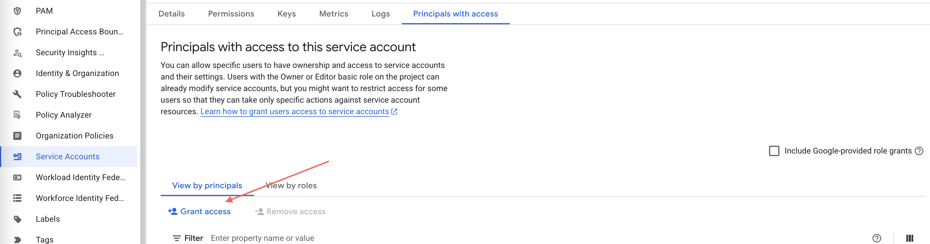 1. 방금 만든 서비스 계정의 행에서 **작업**을 클릭한 다음 **세부정보 관리**.