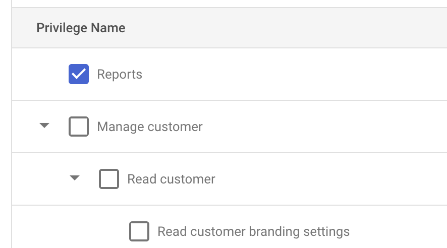 * 사용자에게 이 권한이 없는 경우 [이 Google Workspace 지침](https://support.google.com/a/answer/2406043) 에 따라 Reports 액세스 권한이 있는 새 역할을 만들고 해당 역할을 사용자에게 할당하세요.