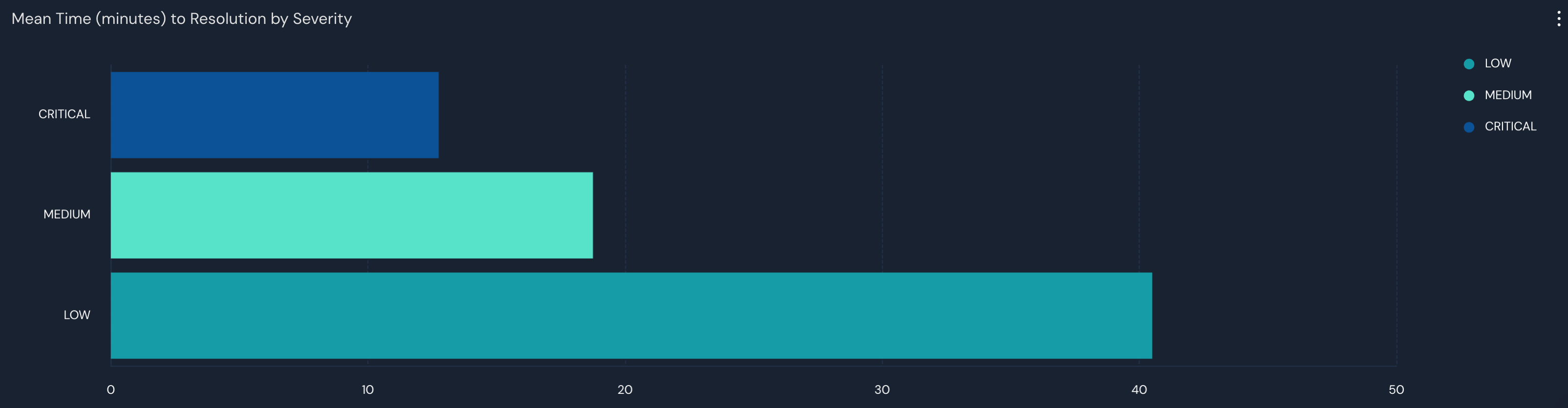 | visualize bar orientation=horizontal, legend=right, title="Mean Time (minutes) to Resolution by Severity"