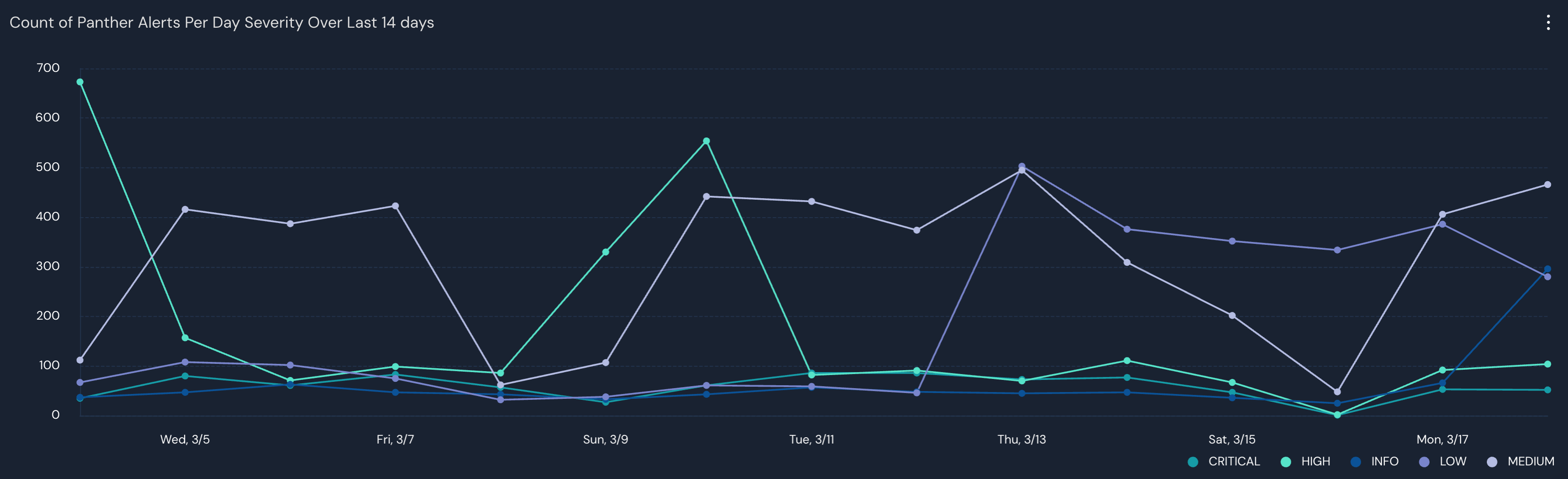 | visualize line xcolumn=bucket, ycolumn=eventcount, series=severity, legend=bottom, title="Count of Panther Alerts Per Day Severity Over Last 14 days"