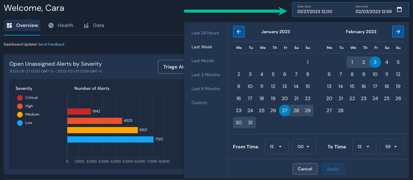 Use the date range picker in the upper right corner of the page to set a time range for all charts in the dashboard. This filter defaults to showing the last week.
