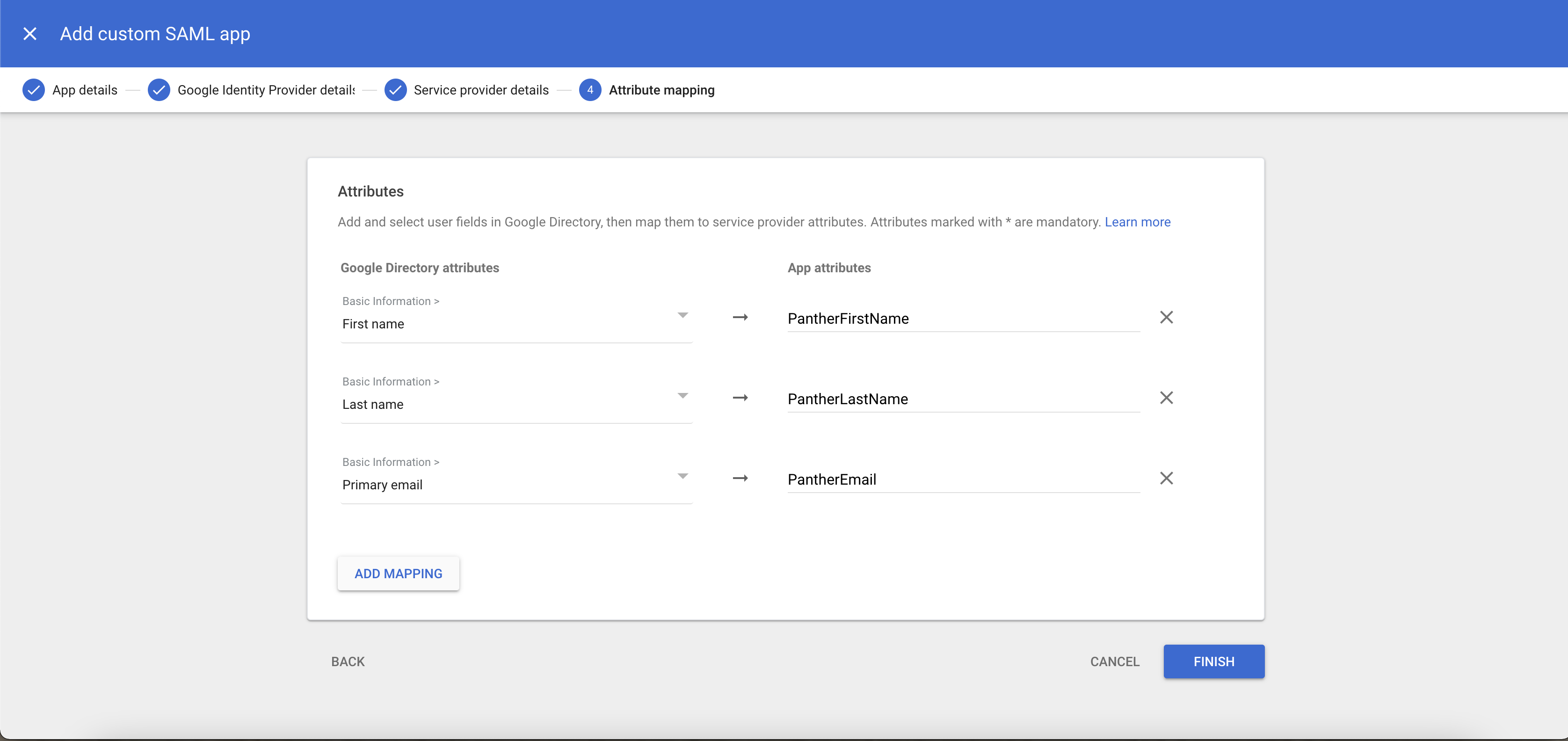 Panther supports integrating with G Suite (now named Google Workspace) as a SAML provider to enable logging in to the Panther Console via SSO.