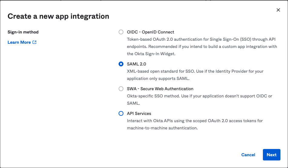 3. Within the "Create a new app integration" screen, select **SAML 2.0** as your "Sign-in method":